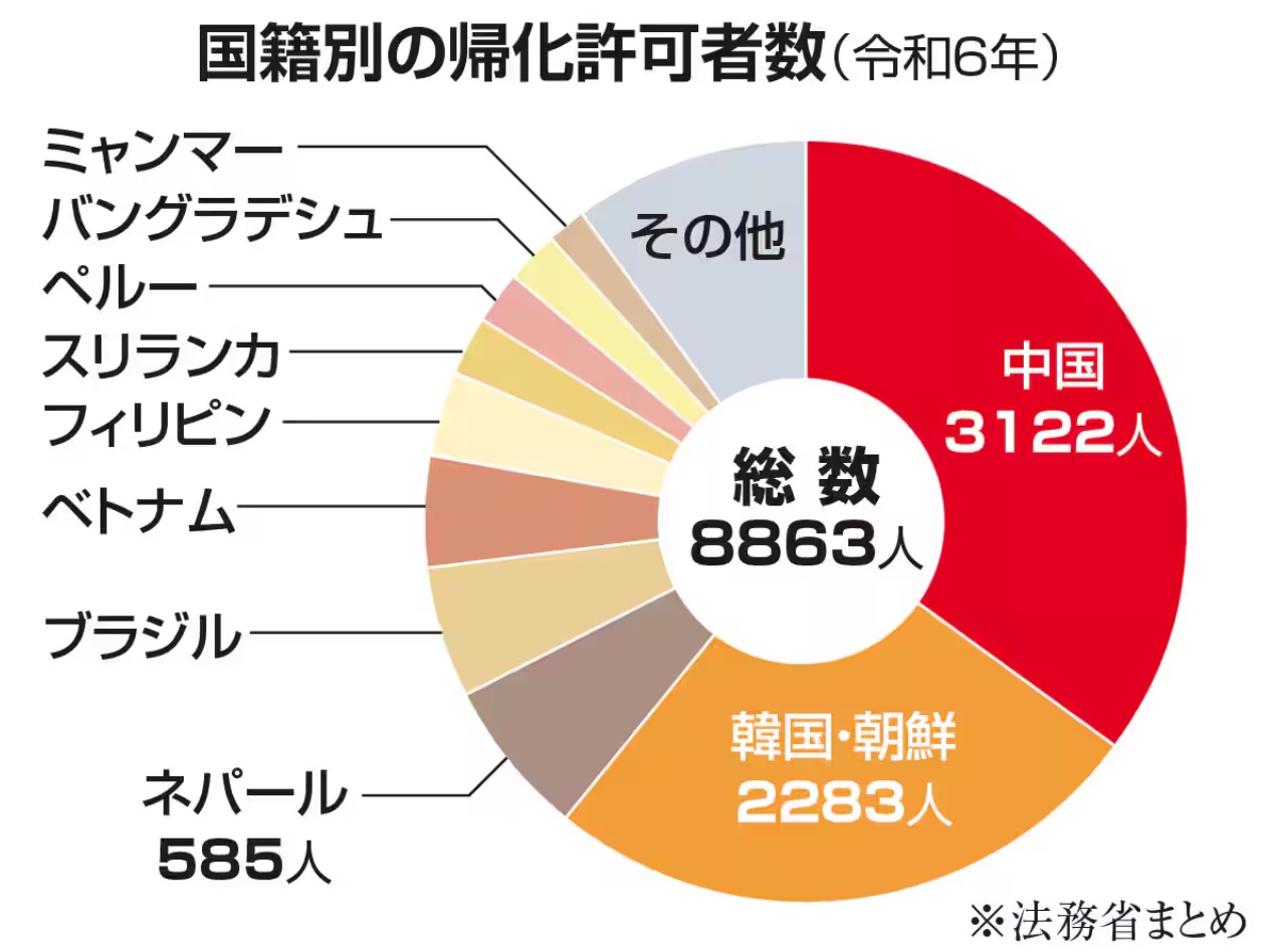 日本法务省的统计数据显示,去年(2024年)一年内取得日本国籍的归化者人数约为8800人。其中,来自中国的归化者约3100人,首次超过韩国/朝鲜籍的年度归化者人数,这也是近50年来的首次。与此同时,来自尼泊尔、斯里兰卡等中国和韩国/朝鲜以外国家的归化者数量也在增加,过去五年内翻了一番。