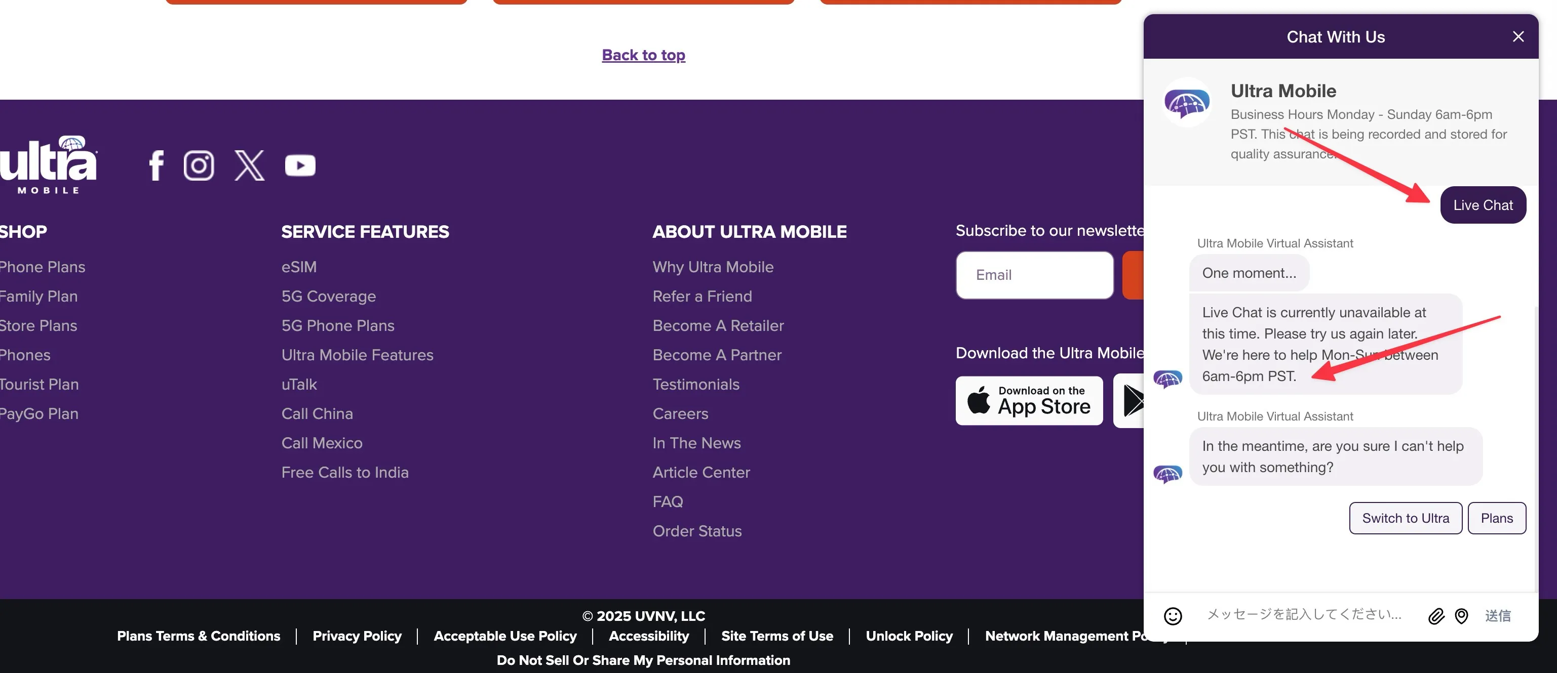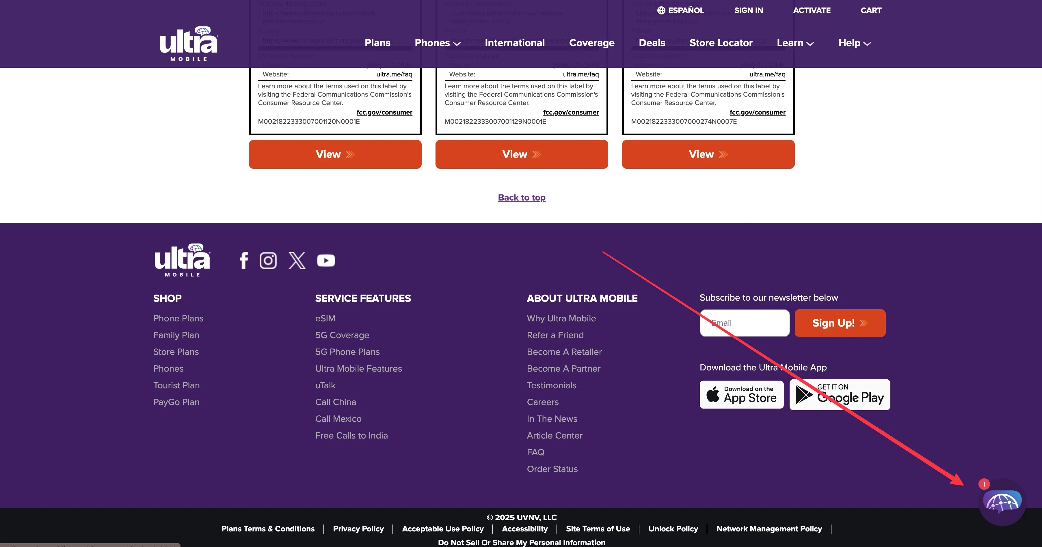 具体操作很简单,我们只需要到Ultra Mobile的官网,无需登录,直接页面拉到最下面,点击页面右下角的在线客服。