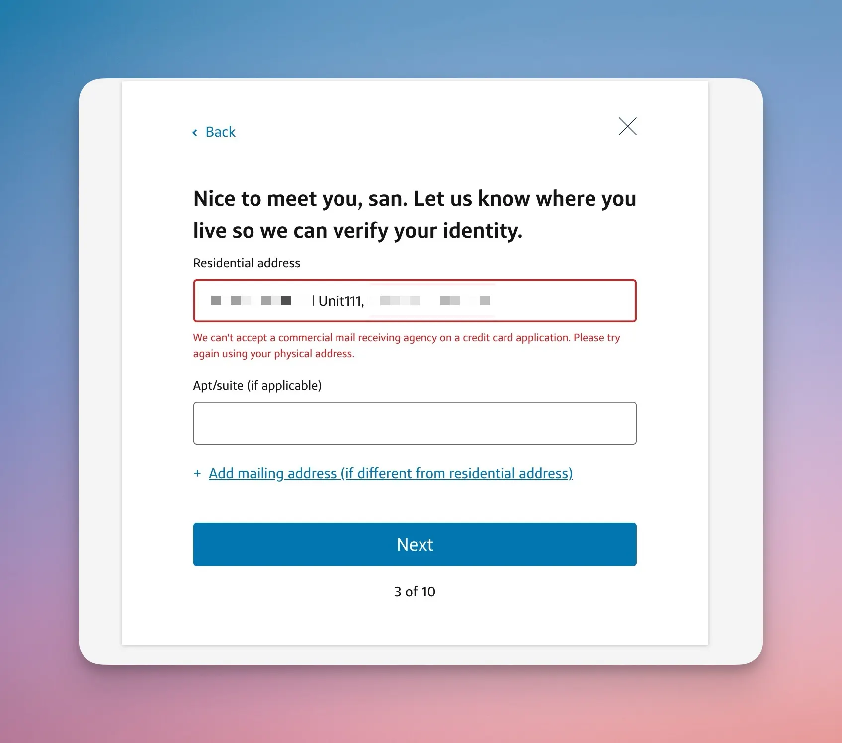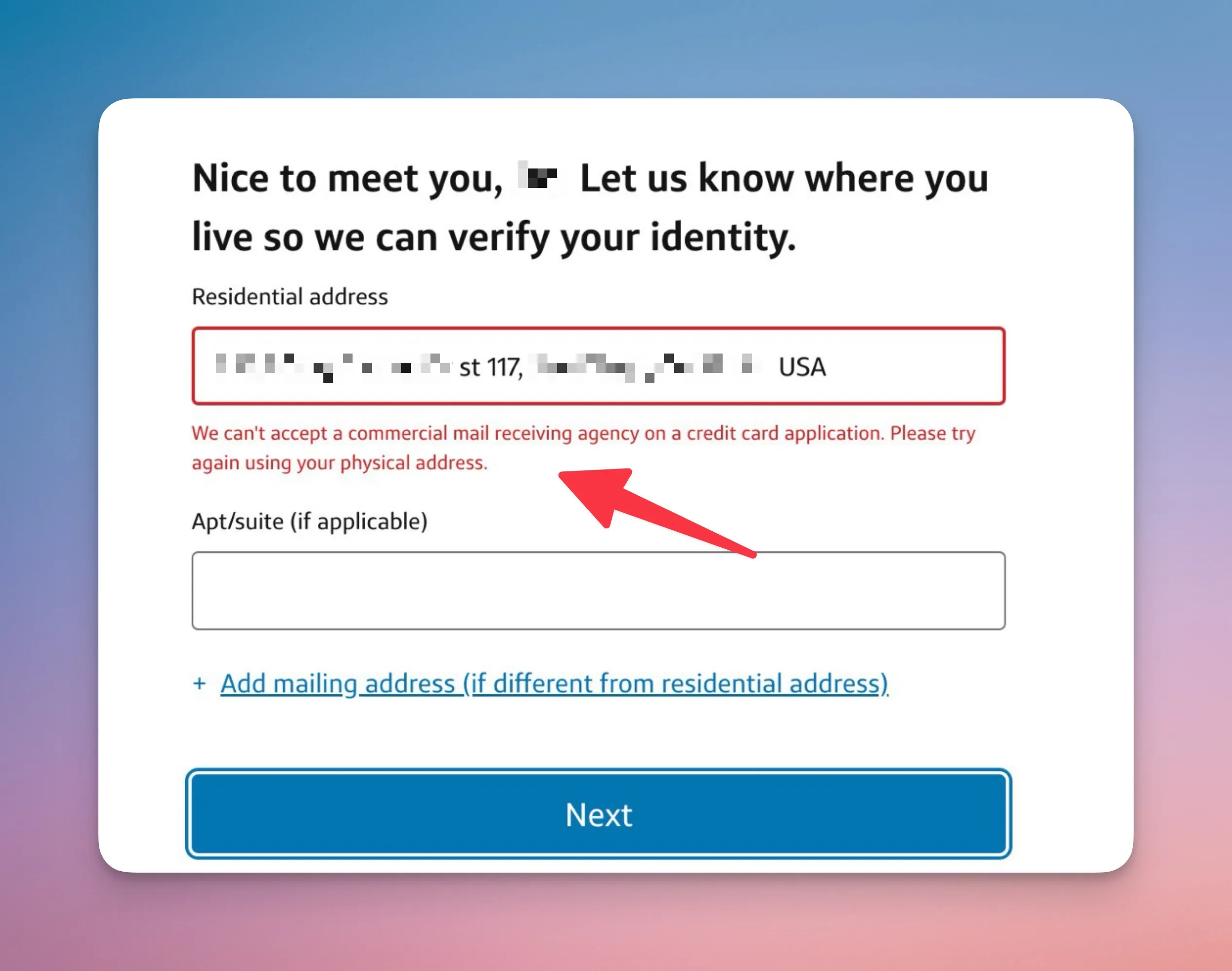 We can’t accept a commercial mail receiving agency on a credit card application. Please try again using your physical address.(我们不接受商业地址为申请信用卡,请使用您的实际居住地址。)