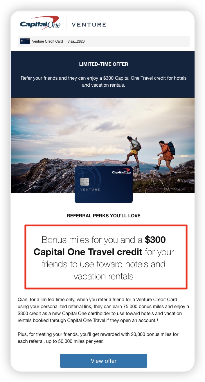 通过我们的推荐链接成功申请Capital One Venture信用卡,送75000积分(最低价值750美元),并赠送300美元旅行额度,可以抵扣机票酒店费用。
