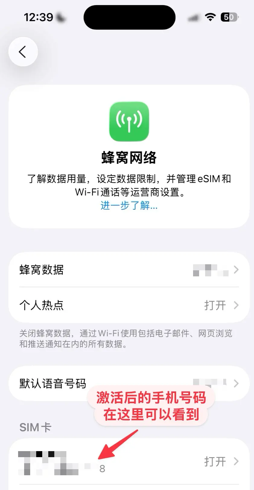 首先,激活后我们把卡插到手机,然后点击手机的设置-蜂窝网络,就可以看到插入手机卡的手机号码了。